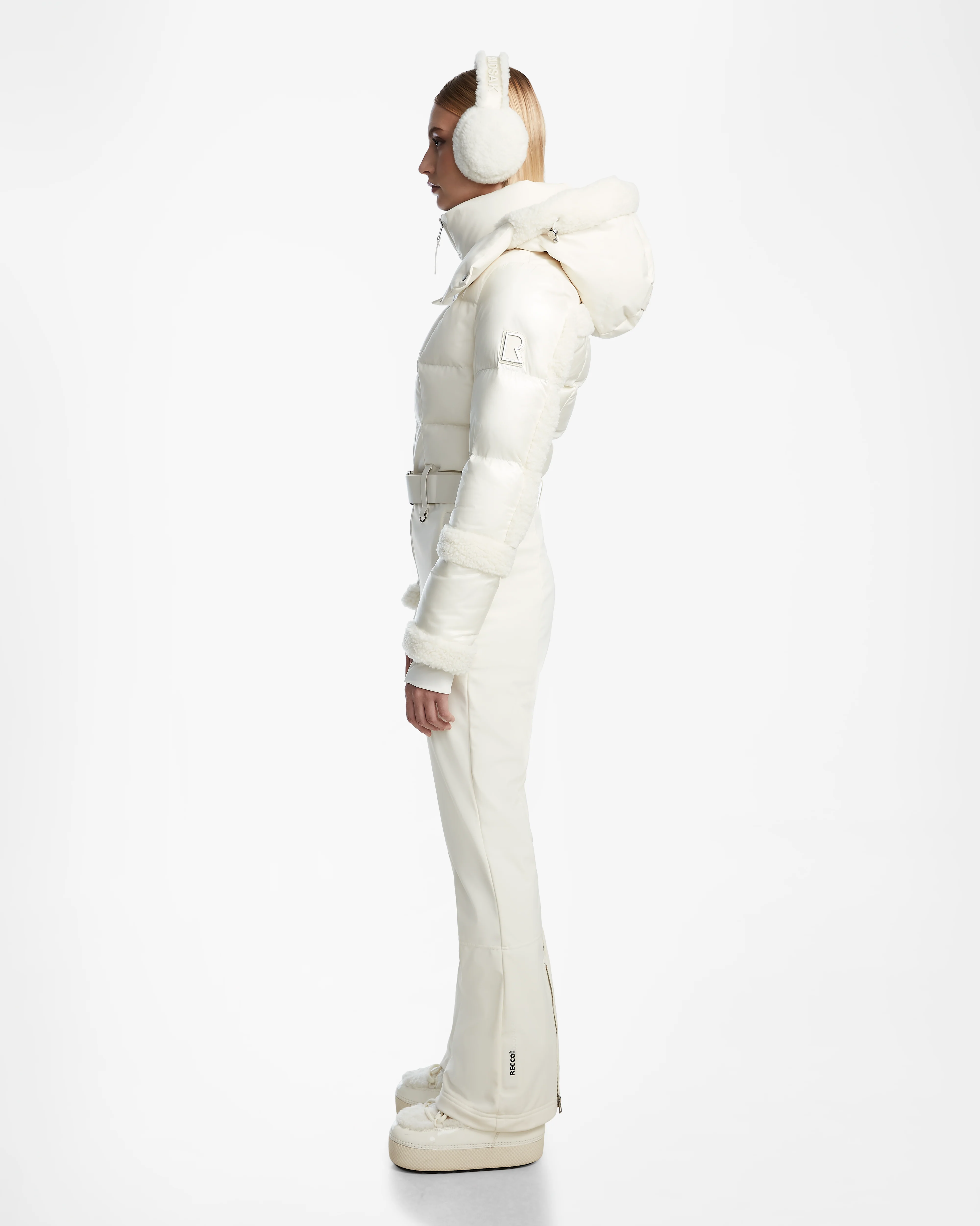The CARMEN by RUDSAK is a fitted one-piece ski suit that blends performance with bold style. It features a sleek silhouette with a technical stretch exterior and quilted upper body with glossy quilted sleeves, accented by luxe faux shearling details. A hood, vegan leather trims, and a removable waist belt offer both functionality and a chic edge. Hip pockets, back zippers on the legs, and reinforced inner kick panels enhance practicality, while RECCO rescue technology provides safety. This eye-catching ski suit is designed for making a bold statement on the slopes.