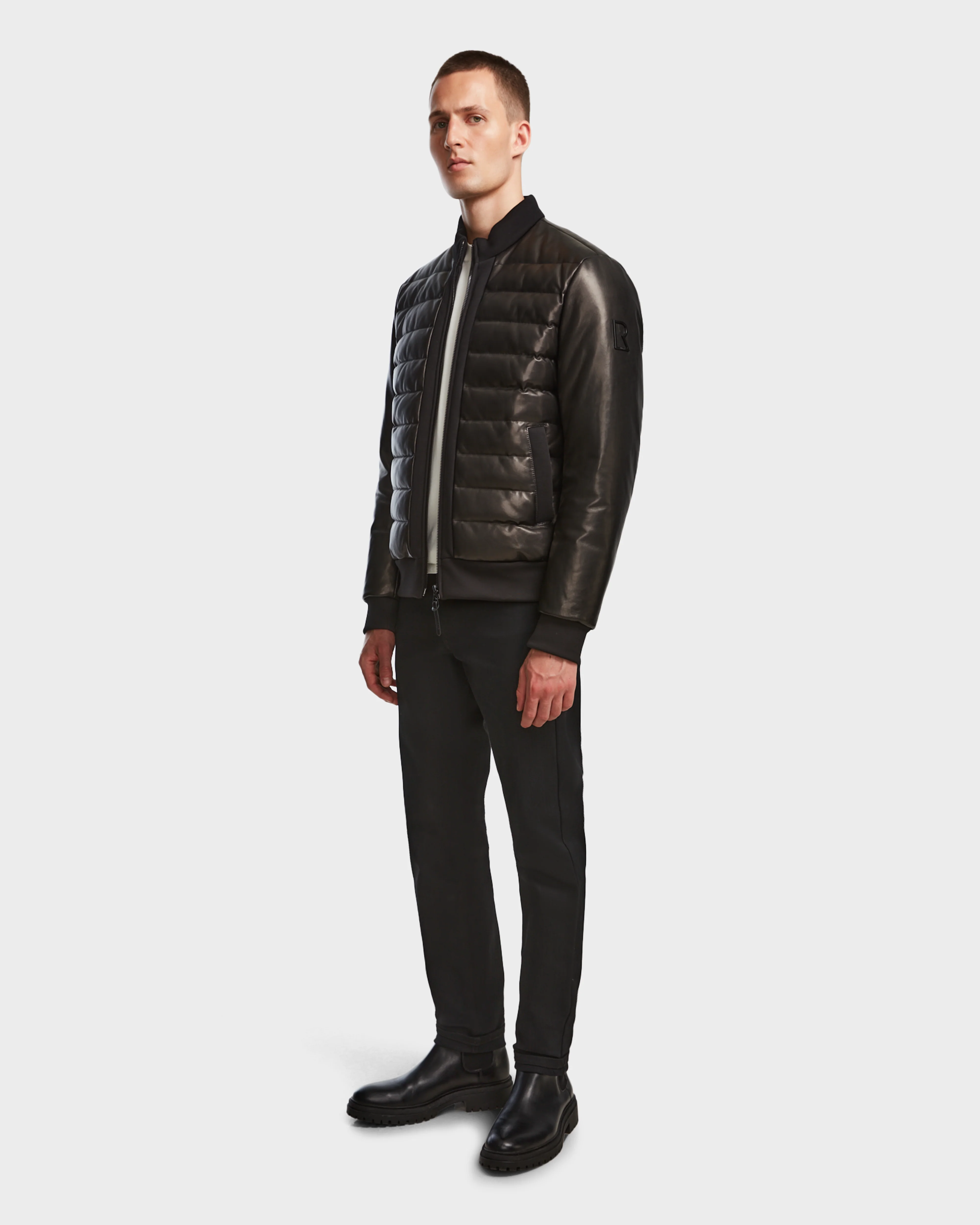 The JIMMY X is a men's quilted leather down jacket that exudes luxury and functionality. Insulated with RDS-certified down, this jacket offers unparalleled warmth while maintaining a sleek look. It features hip pockets for convenience and a stylish mock-neck collar with a center front zip, ensuring a snug fit. The cuffs, hem, and mock-neck are trimmed with a material combo, adding a distinctive touch. Perfect for the modern man, the JIMMY X combines premium materials with sophisticated design, making it a standout piece for any wardrobe.